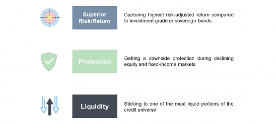 - Der Fonds konzentriert sich derzeit auf das BB-Kreditsegment, das Vorzimmer zu Investment Grade, und bietet ein Engagement in Unternehmen mit geringer Verschuldung und besonders niedrigen Ausfallquoten. Die von diesen Emittenten angebotenen Anleihen sind zudem sehr liquide und haben ein betrÀchtliches Volumen (> EUR 500 Mio.).