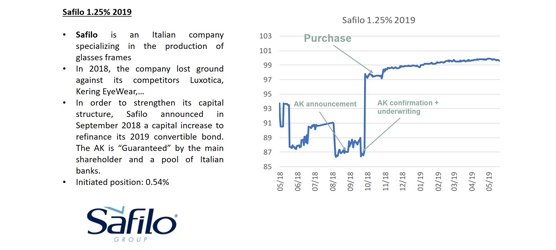 17 Settembre 2020 - Two examples of recent investments that demonstrate the Anaxis Short Duration fund's ability to seize opportunities The Anaxis management team describes two examples of recent investments that demonstrate its Short Duration fund's ability to seize opportunities, even in difficult market conditions. On top of its investments for the Anaxis Short Duration fund's core portfolio, the management team also makes more opportunistic purchases. An example of this is a short-term acquisition that we made at the end of 2018 in a bond issued by Italy's Safilo, a leading glasses frame producer. At the time, the company was competing with Luxottica and Kering in particular. These bigger rivals were enjoying stronger sales growth. To reinforce its capital structure, Safilo announced a capital increase aimed first and foremost at repaying a bond maturing in May 2019 but also, more generally, at taking advantage of improved margins to kick-start its business. After the initial announcement, the bond picked up a little in September 2018, rising from around 87% to 90% of the nominal. However, it was really when the EUR 150 million capital increase was confirmed and above all underwritten by a pool of issuing banks that the bond quickly converged towards par, as it would be redeemed at this price in May 2019. We therefore bought the bond opportunistically at a little over 97 in September 2018, following confirmation of the capital increase, and benefited from repayment at par just a few months later. These trades are less frequent than our core portfolio investments. The positions are for smaller amounts (0.5% of the fund's value at the time for Safilo) but they allow us to seize opportunities with a very high annualised return of 6% or 7% over a short period. The main reason for our access to this type of trade is our strong long-term relationship with a number of counterparties who can put forward such ideas when they emerge. A second example of an opportunity, taken this time during the crisis of early 2020, is Ardagh. We particularly like the packaging industry as it is resilient and non-cyclical. Ardagh is one of the world's leading producers of metal and glass packaging for food and drinks, with an equal split in terms of end markets. The company is number one or two on most of its markets, especially in Europe and the United States. Ardagh enjoys a strong long-term relationship with its clients. These are highly diversified and are mostly blue chip companies such as Pepsi, Coca-Cola, Findus and Nestlé, making its end markets even more stable. Capital expenditure is pretty hefty as production apparatus must be updated regularly. This business model therefore generates free cash flows, albeit at a consistently modest rate. The company's FCF oscillates between 0 and 5% of gross debt, meaning that deleveraging would take time. However, this has not stopped the company from refinancing very easily, even in difficult periods for the markets such as the recent one, and taking advantage of a well-managed debt ratio. How has our investment in Ardagh's 2.75% 2024 bond fared? Ardagh is an issuer that we have always held in our Short Duration portfolio. We already had a slightly smaller position of between 0.6% and 0.7% of the NAV, which we strengthened in April of this year. The bond was then trading below par. We strengthened in expectation of refinancing not as early as the first call date, which was in early June, but rather on a 2021 or even 2022 horizon. However, soon after our purchase the company announced that it was refinancing this 2024 bond at the first call price of 101.375. We had bought the bond at around 97 a month earlier, and therefore reaped an annualised return of around 25%, even though such an early call had not been our central scenario. This example shows that issuers like Ardagh, whose business model is very stable, are capable of overcoming the type of volatility that we have seen in recent months, and keeping relatively easy access to the markets, even without a government support package or help from shareholders. This regular access to the markets allows us, as investors, to generate attractive capital gains when the opportunity arises in resilient sectors like this one.
